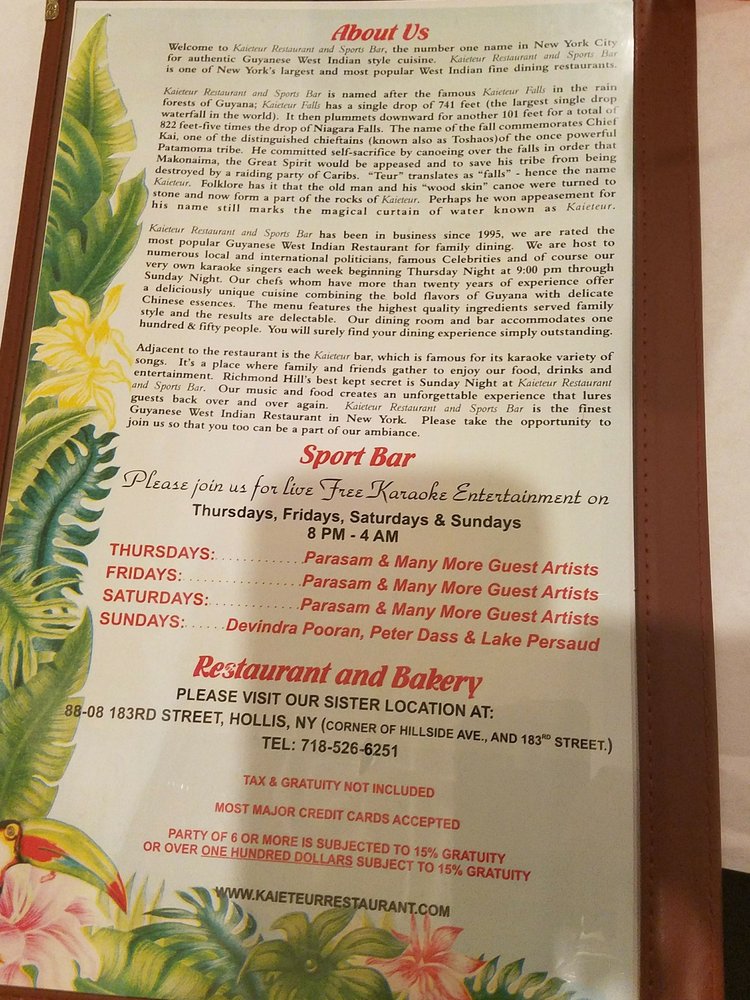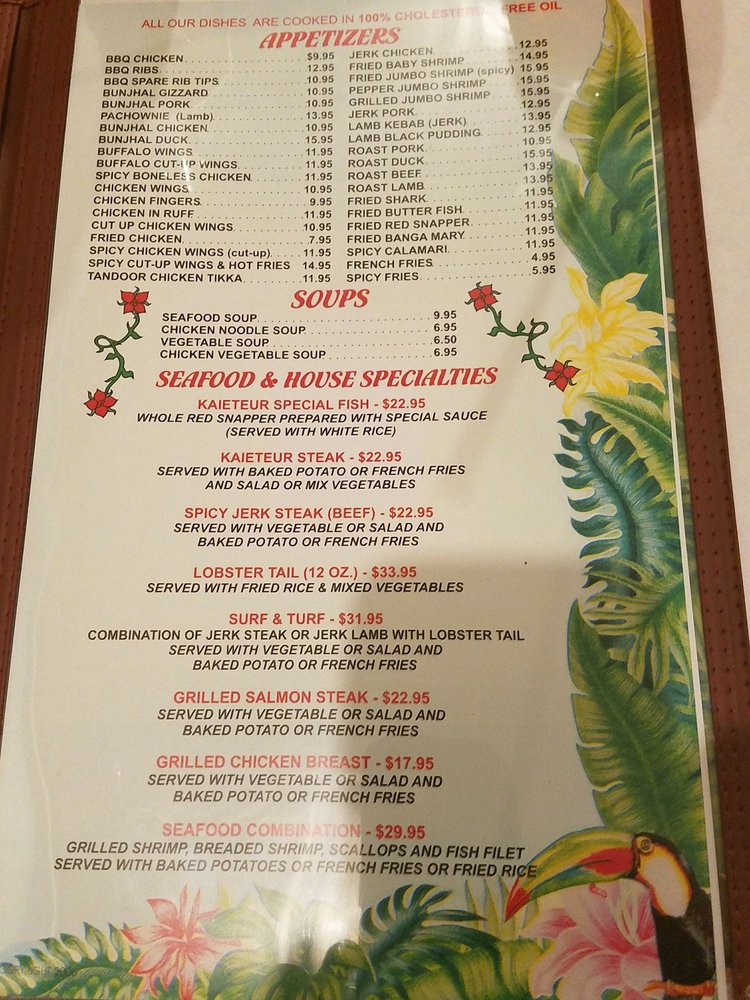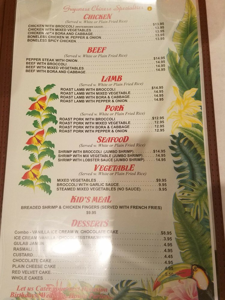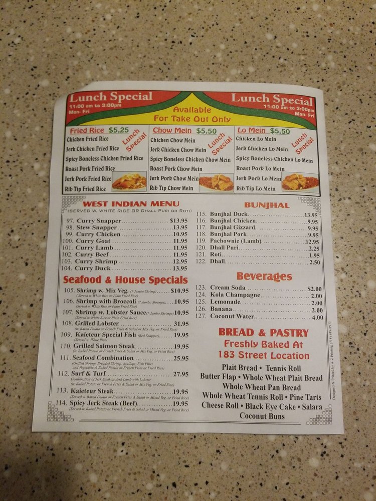 Kaieteur Restaurant in Richmond Hill, NY, offers a diverse menu of Guyanese and Chinese fusion dishes. From flavorful appetizers like Jerk Chicken to hearty soups and tasty Seafood Combination platters, there is something for everyone. The restaurant provides excellent service and fast delivery options, making it a go-to spot for lunch, dinner, and late-night cravings. The ambiance is family-friendly, with casual seating and a full bar for those looking to relax with a drink. Don't miss out on their unique beverages like Cream Soda and Kola Champagne. Overall, Kaieteur Restaurant stands out for its delicious food, friendly staff, and comfortable dining experience, making it a must-visit for those craving a taste of authentic Guyanese cuisine with a Chinese twist.